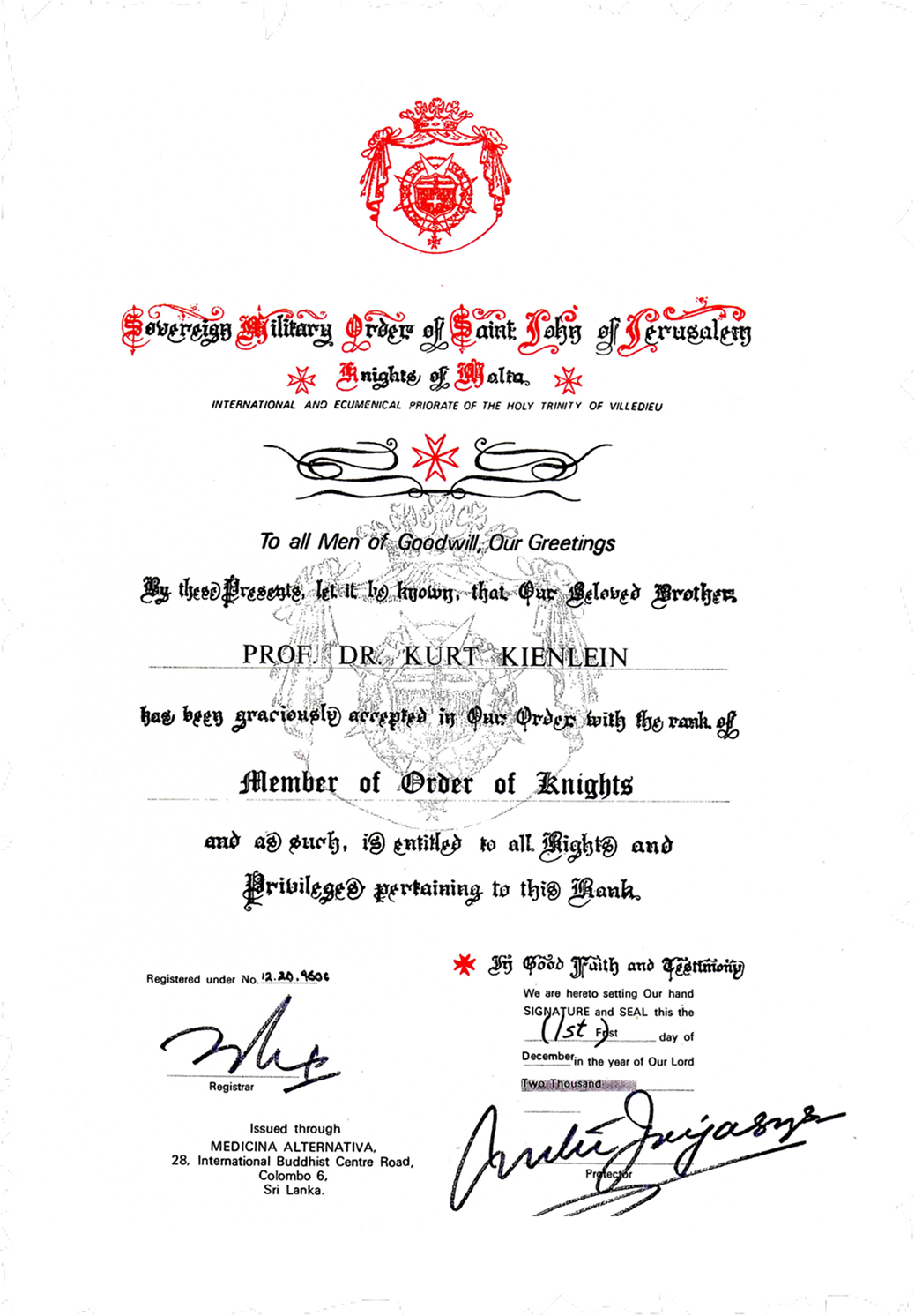 Принят в Орден с рангом «Member of Order of Knights». Обладает всеми правами и привилегиями, соответствующими этому званию.