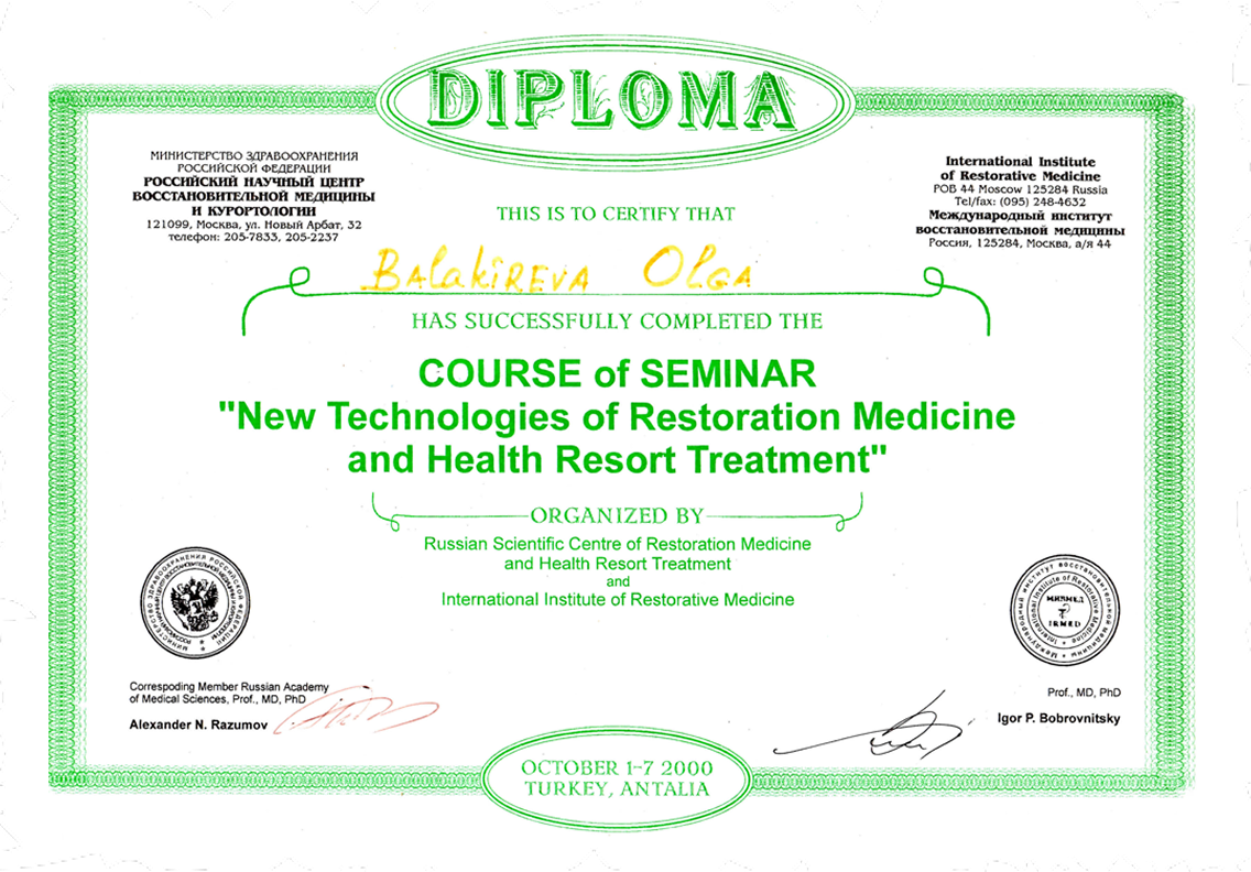 Диплом о прохождении курса “Новые технологии восстановительной медицины и курортологии”