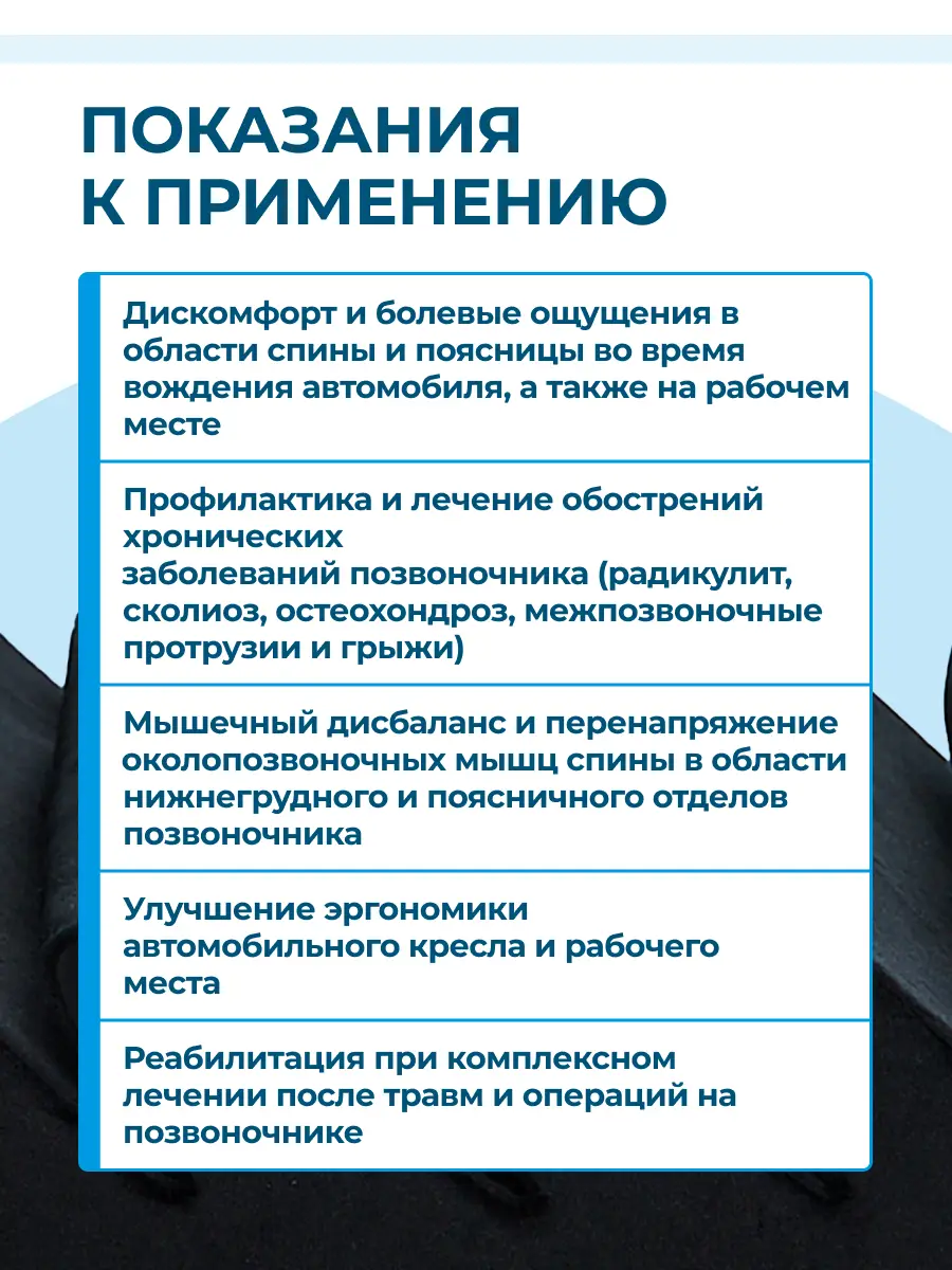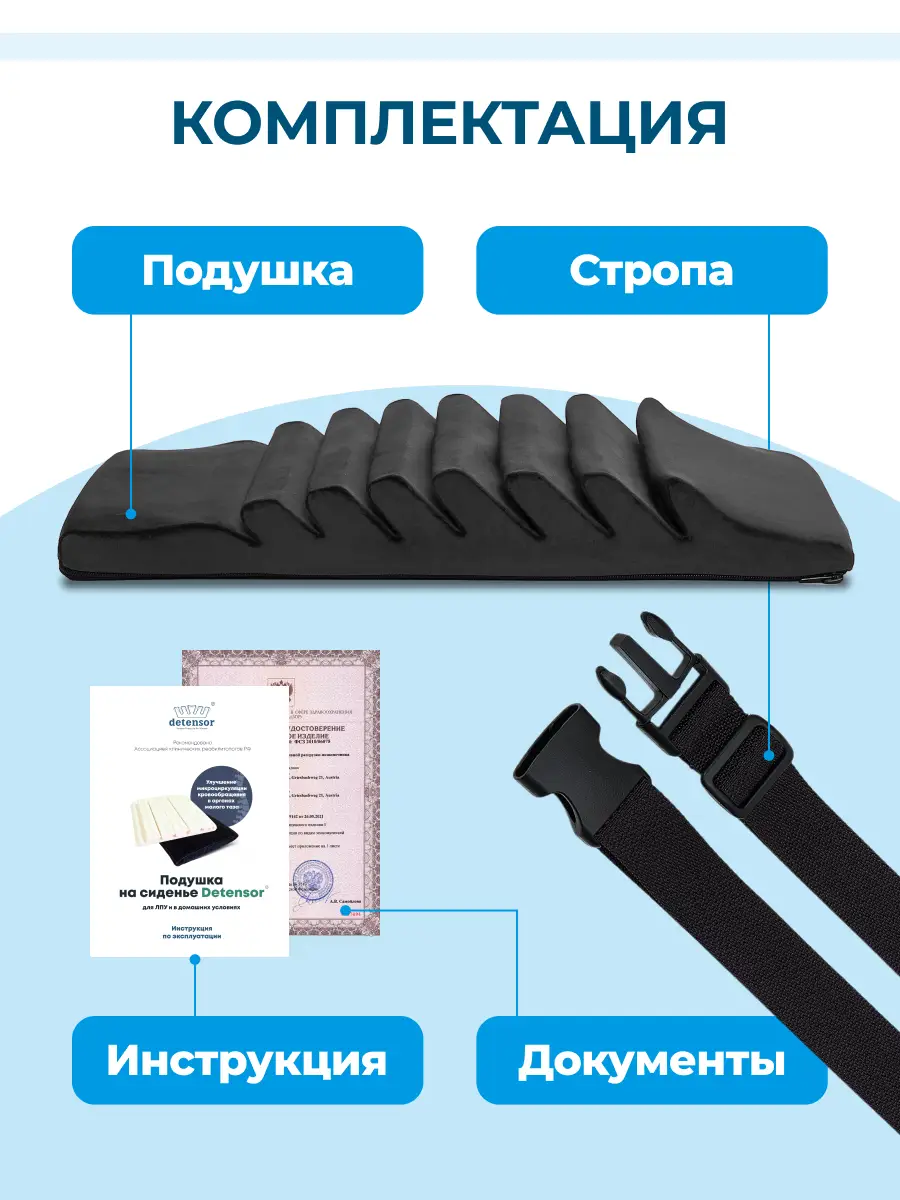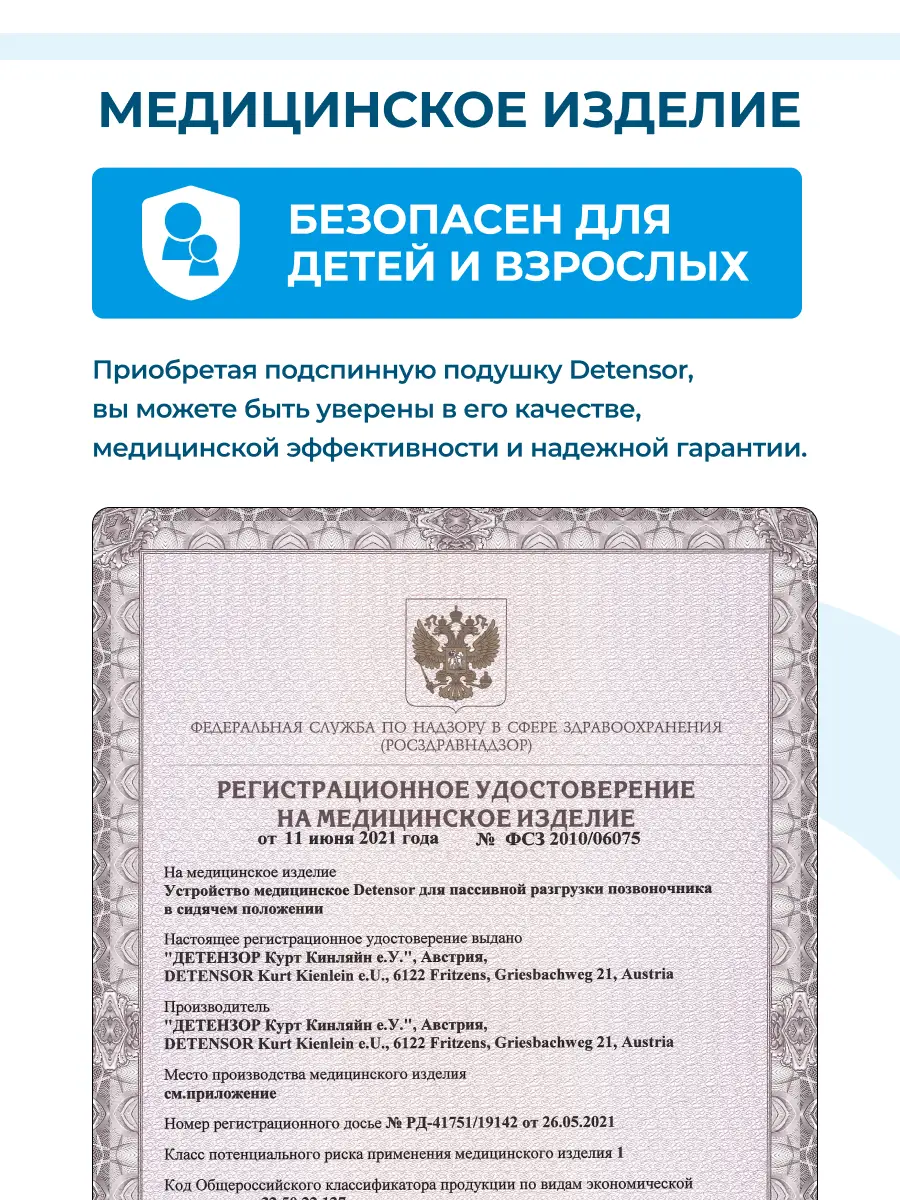 Подспинная подушка с системой Detensor зарегистрирована в Росздравнадзоре как медицинское изделие. Это подтверждает её безопасность, эффективность и соответствие установленным стандартам. Подушка разработана для реабилитации, восстановления позвоночника и снятия напряжения при длительном сидении.