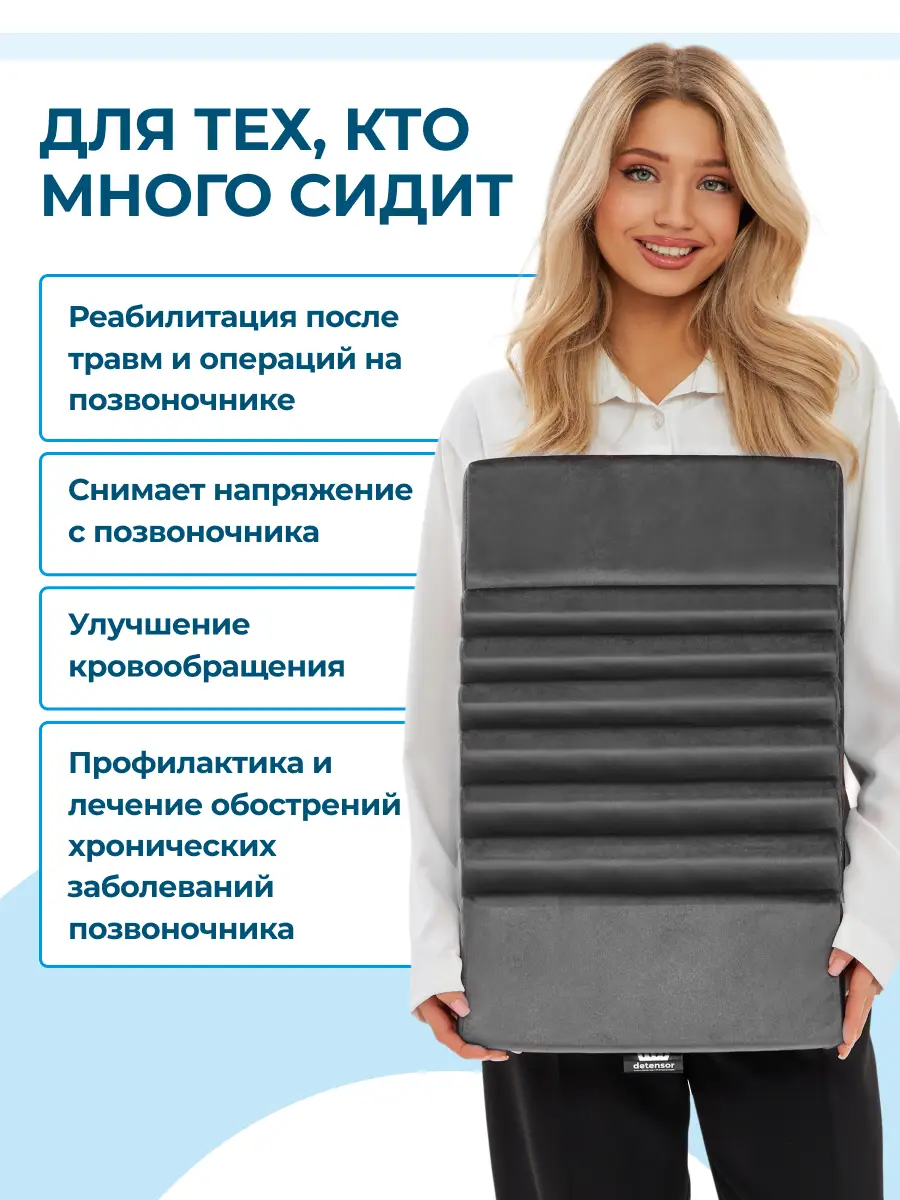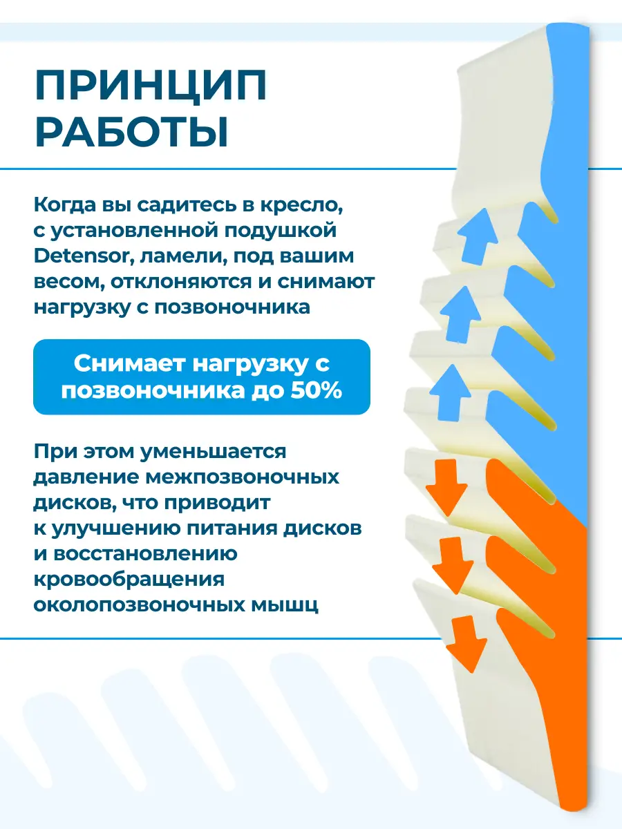 Подушка Detensor уменьшает компрессию позвоночника, снижая нагрузку на межпозвонковые диски, разгружает мышцы и мягкие ткани, предотвращая усталость, а также поддерживает осанку, помогая избежать дискомфорта при длительном сидении.