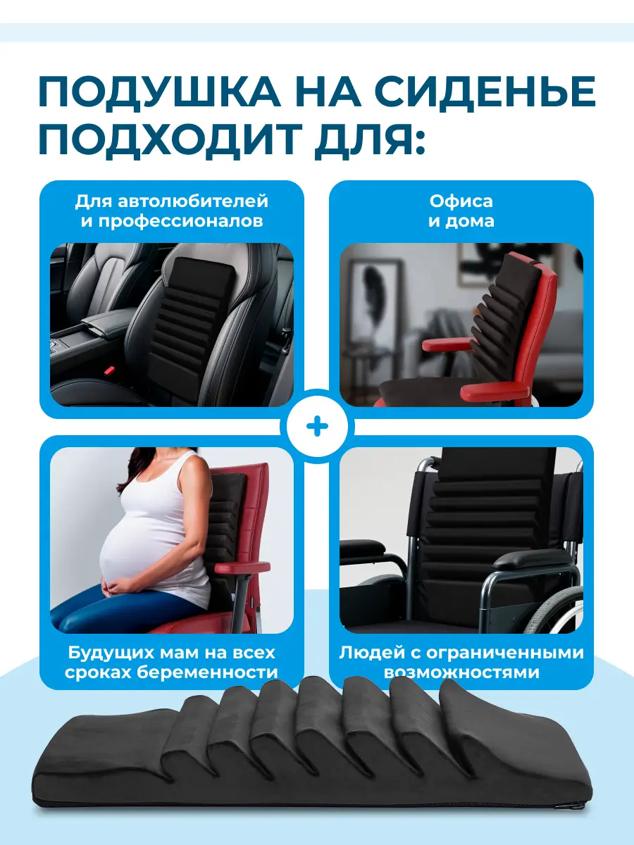 Сидеть стало удобнее. Производство Австрия. Есть инструкция и рекомендации по использованию. Удобно заказывать по яндекс сплит, без переплат. Подушку посоветовал доктор,при обострении грыжи. Действительно, сидеть в машине за рулём гораздо легче. В водительское кресло встала как влитая.. Дома в кресле тоже очень удобно. У кого проблемы с позвоночником однозначно рекомендую.