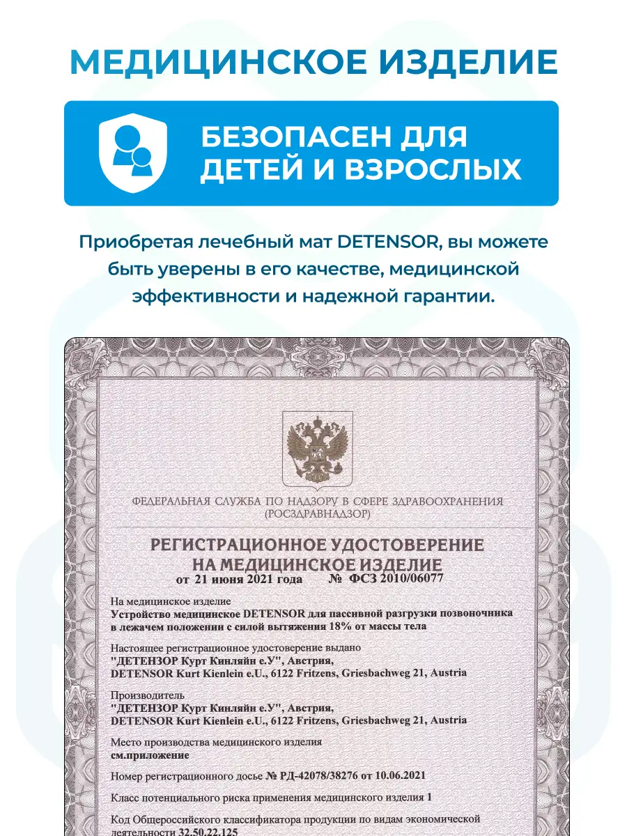 Первый раз узнала о детензоре в санатории, и после нескольких сеансов почувствовала, что пояснице стало легче. Поэтому спустя время, когда проблемы с позвоночником опять дали о себе знать - сколиоз остеохондроз грыжи решила что надо как то себе помогать на постоянной основе и вспомнила о детензоре! Конечно сомнения были, тк цена не маленькая и другие вопросы возникали! В офисе менеджер Оксана, очень грамотно и информативно расширила мои представления о положительных свойствах этого мата! И после пробных сеансов решение о покупке было принято! Сейчас использую его почти ежедневно вечером- после рабочего дня помогает снять напряжение, усталость и дискомфорт -мяго растягивая позвоночник. Можно совместить с просмотром сериала. Иногда в конце делаю упражнения для укрепления корсета. Конечно все проблемы не ушли, но есть облегчение! Надеюсь на положительную динамику!