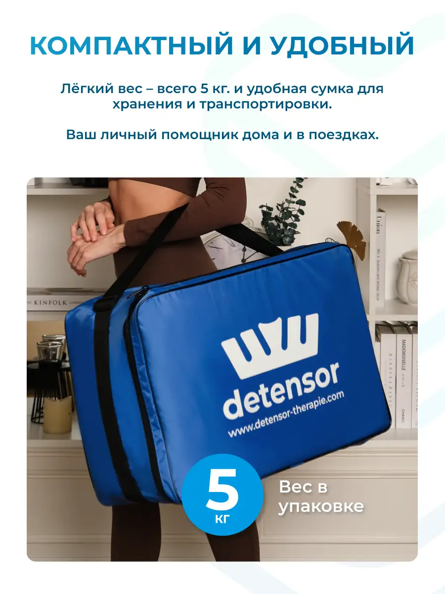 Про Детензор знала давно.. Вот настало время его купить. Думала только себе оказалось всем в семье стало интересно. Большая благодарность консультанту - Оксане Викторовне за подробнейшую консультацию и полномасштабную демонстрацию. Купила в дополнение: 1- подушку для сна -спиться сладко ,отдых отменный(использую и под спину в кресле-волшебно) ,2-дополнительный валик под шею, рост до 150 см.3- чехол на шейные валики. Уже используем, довольны. Буду делать демонстрации друзьям и советовать к приобретению этого ,нужного сегодня, медицинского прибора.(не побоюсь этого слова).Всем здравия и процветания!