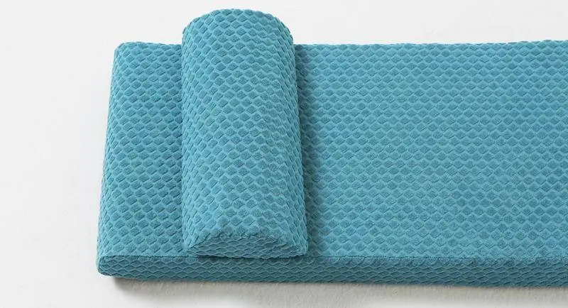 Что касается самого мата, то пока чехол не снимешь, не увидишь что конкретно прячется под ним. Он плотный, но съемный, поэтому можно и постирать. Начинка не крошится и не растрескивается, жесткость осталась прежней (всего их три — у меня средняя), когда встаешь мат возвращается в исходную форму, нет никаких провалов и впадин.