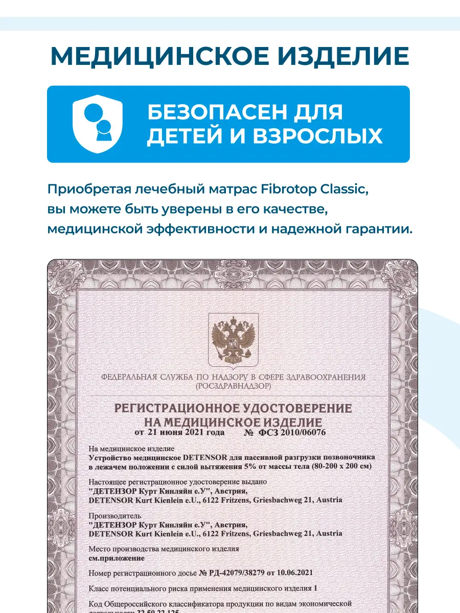 Fibrotop Classic имеет регистрационное удостоверение Росздравнадзора, что подтверждает его статус медицинского изделия. Это значит, что вы получаете продукт, разработанный для реабилитации, восстановления позвоночника и снятия напряжения. Спите спокойно, зная, что ваш выбор одобрен медицинскими специалистами.