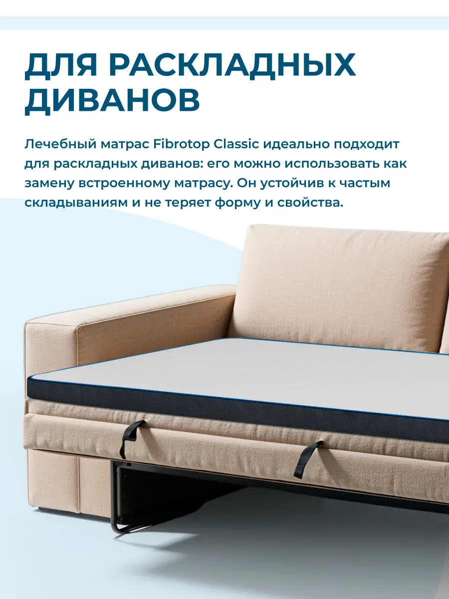 Fibrotop Classic можно использовать поверх вашего матраса для улучшения его характеристик или заменить матрас раскладного дивана, обеспечивая надежную поддержку и комфорт.