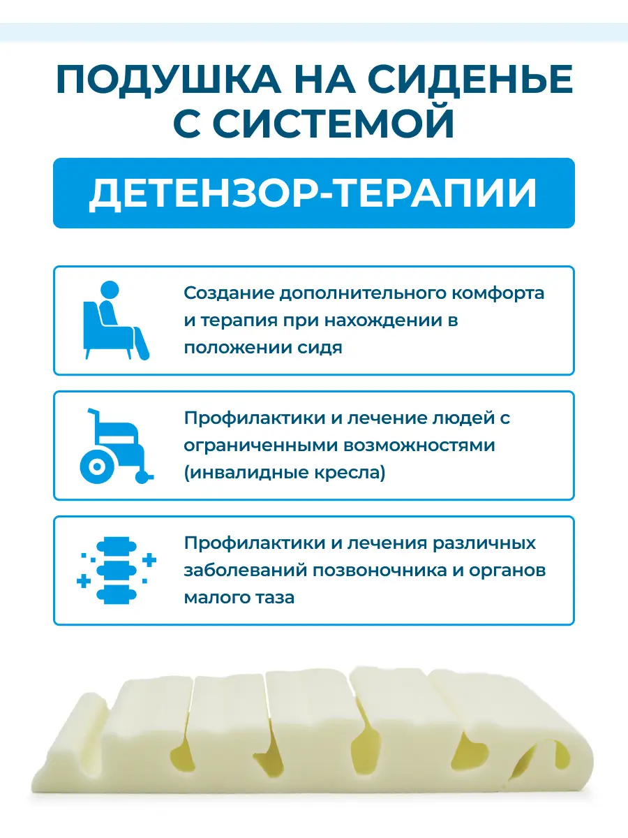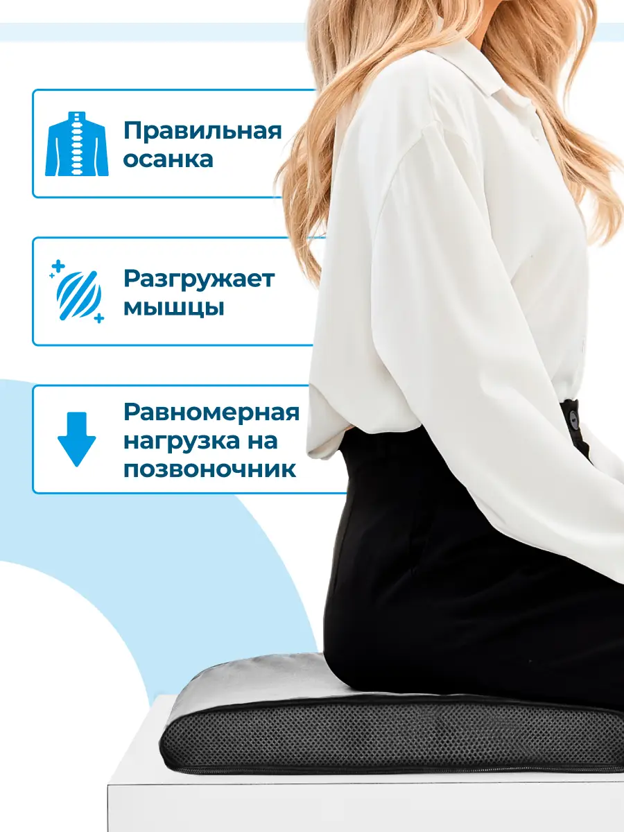 Конструкция подушки имеет специальную реберную форму, которая мягко поддерживает бедра и ягодицы, способствуя оптимальному кровообращению в ногах. Подушка улучшает кровообращение и лимфоток, поддерживая правильное функционирование сосудистой системы.