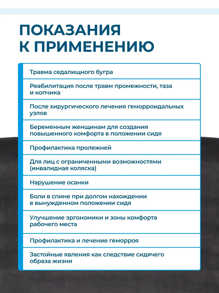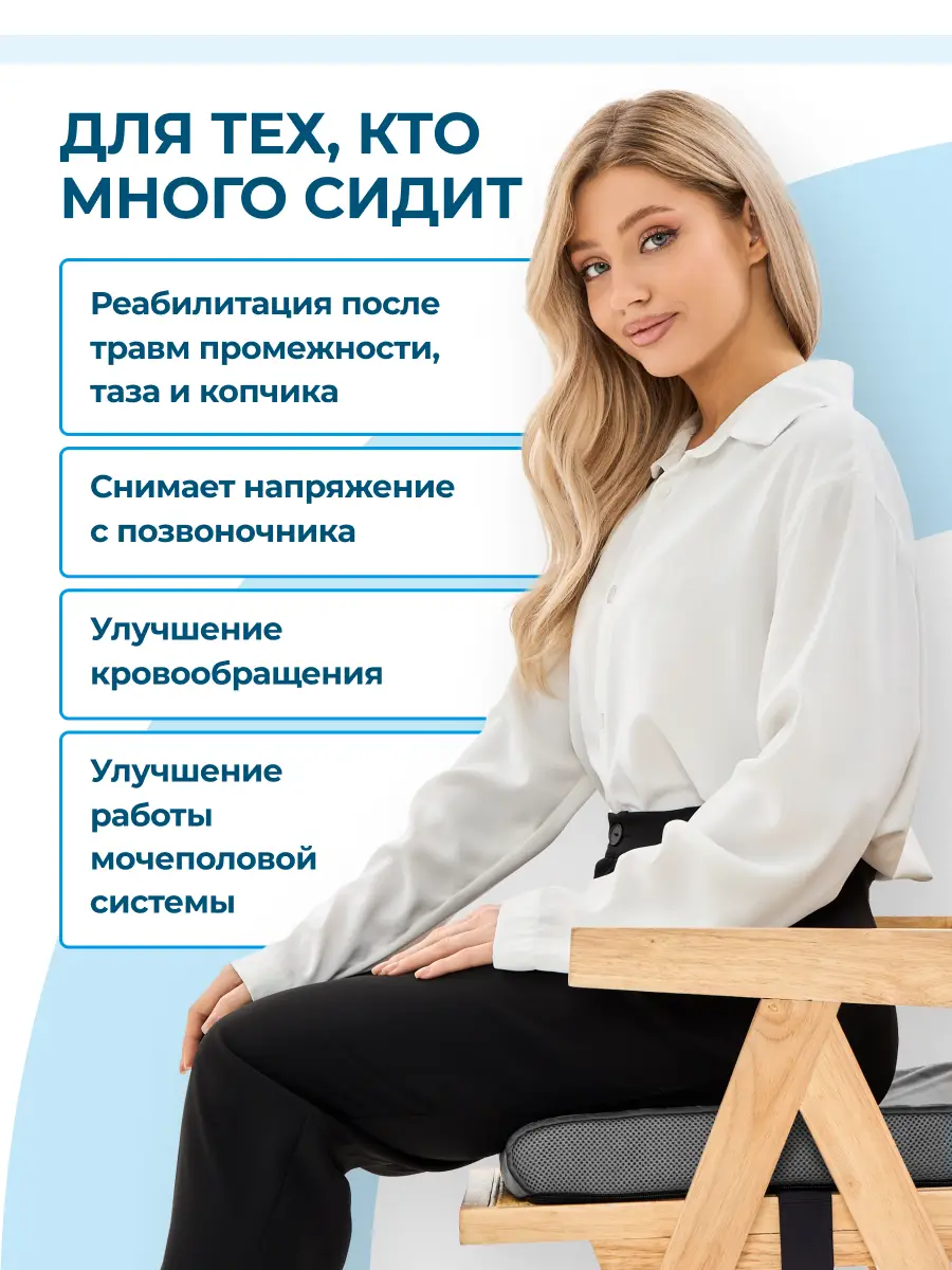 Предназначена для улучшения микроциркуляции и кровообращения в органах малого таза, устранения болей в копчиково-крестцовом и поясничном отделах позвоночника, а также нормализации тонуса ягодичных мышц при длительном сидении.