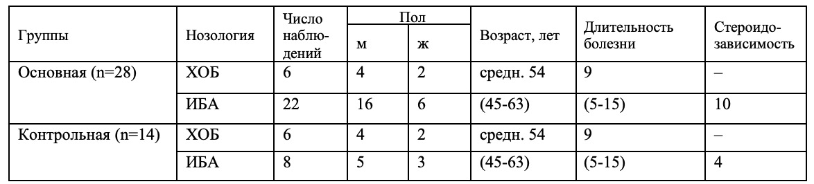 Для решения поставленных задач было обследовано 42 пациента, длительно страдающих хроническим обструктивным бронхитом (ХОБ) и инфекционно-зависимой бронхиальной астмой (ИБА). Клиническая характеристика групп больных представлена в табл. 1.