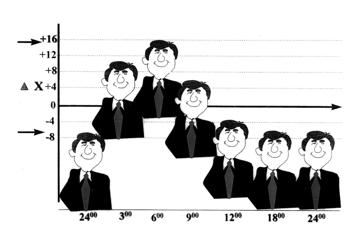 На рисунке стрелками показано поступление жидкости в межпозвонковые диски (регидратация) в период, ориентировочно, с 2400 до 800 и ее потеря (дегидратация) в период с 800 до 2400 часов.
