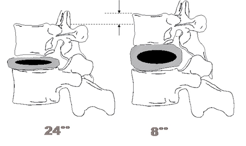 В здоровом позвоночнике вследствие поступления жидкости в межпозвонковые диски в период с 24 до 8 часов отмечается увеличение ПДС. Величина прироста ПДС указана стрелками. Нарушения в позвоночнике препятствуют этому удлинению и полноценному метаболизму в межпозвонковых дисках, позвонках и паравертебральных тканях.