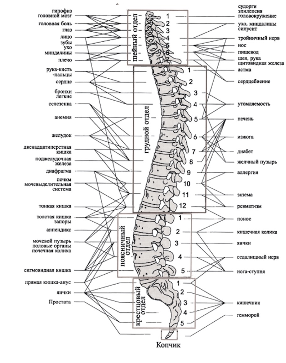 Установлено, что, например, в грудном отделе позвоночника вместо положенных 12 ПДС, движение осуществляется за счет работы всего лишь 3-4-6-ти сегментов. На них «ложится» избыточная нагрузка, они быстрее «изнашиваются». В то же время остальные ПДС заблокированы и движения в них или нет или оно значительно ограничено. В результате и с чрезмерно работающих сегментов, и с заблокированных ПДС на внутренние органы и системы организма идет измененная, нарушенная импульсация, что меняет их работу и жизнедеятельность. Эта взаимосвязь представлена на схеме позвоночника (рис. 4).