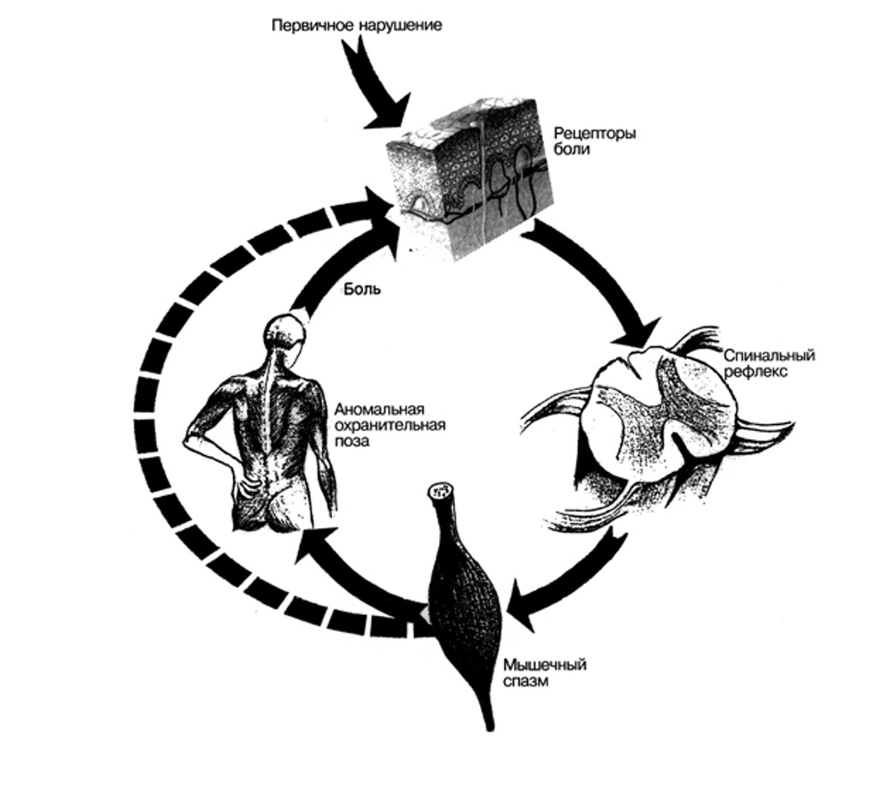 Компенсаторным механизмом ответа организма на пролапс или грыжу диска является мышечный спазм (миофиксация). Протяженностью мышечного спазма определяется изменение двигательного стереотипа вплоть до резкого снижения степеней свободы движения тела при генерализованной миофиксации. Смена изменений двигательного стереотипа от генерализованного через полирегионарный, регионарный, интрарегионарный до локального (благоприятное течение заболевания) приводит к увеличению свободы движений тела. В случаях отсутствия адекватных целенаправленных лечебных и реабилитационных воздействий у пациентов не происходит восстановления нормального двигательного стереотипа, постуральный мышечный дисбаланс прогрессирует. Как результат – сохранение ограничения подвижности в области пораженного ПДС, компенсаторное возрастание нагрузки на другие ПДС и «запуск» патологического процесса уже на их уровне.