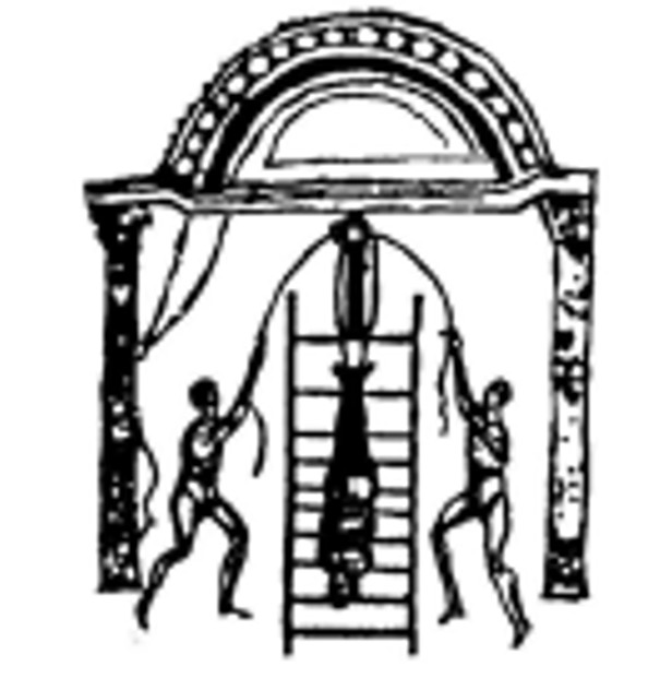 Рис. 9. Пример вытяжения позвоночника с фиксацией и подвешиванием тела за ноги (эпоха Гиппократа, 460–377 гг. до н.э.)