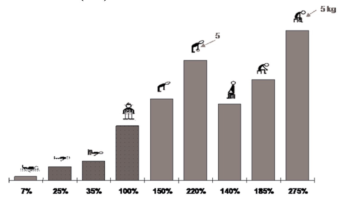 Рис. 12. Степень нагрузки на межпозвонковые диски в различных условиях (в %)