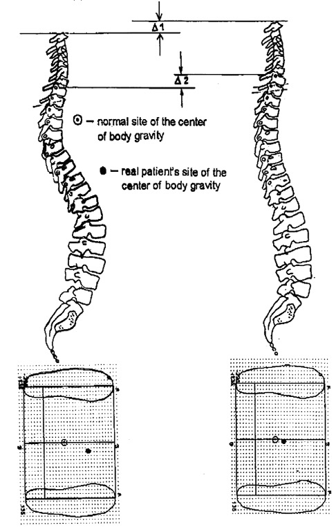 Использование системы Детензор, по данным стабилометрии, способствует восстановлению постурального баланса поддержания тела в пространстве (позы), восстановлению местоположения смещенного центра тяжести у беременных, больных со сколиозом, сколиотической осанкой, синдромом «перевернутого позвоночника» (рис. 13) и тем самым ограничивает позвоночник от чрезмерных нагрузок, перенапряжения и травм мышц спины.