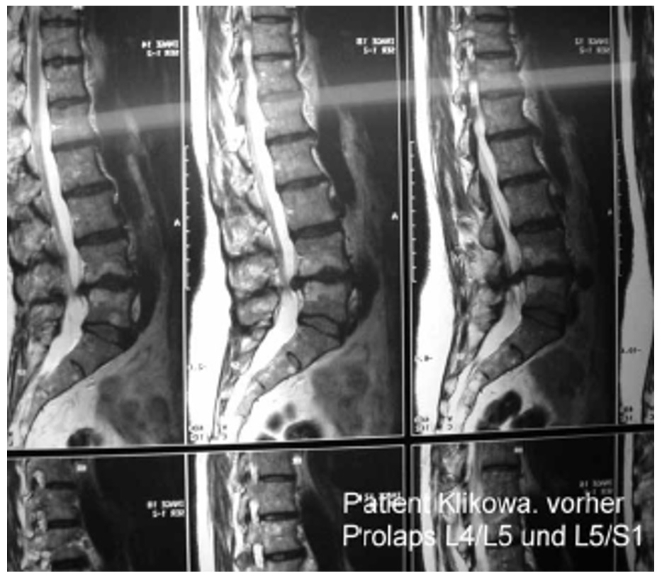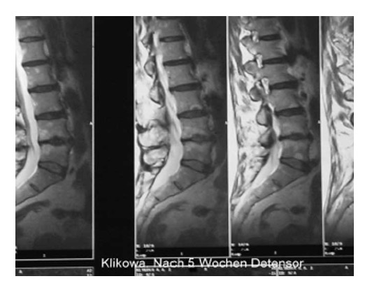 В другом случае, у пациентки П., 58-ми лет, поступившей в ЦР в стадии затянувшегося обострения (9 месяцев) дискогенной радикулопатии L4-S1, также после безуспешных попыток предшествующей терапии (на компьютерной томографии пояснично-крестцового отдела позвоночника: «выпадение» (протрузия) дисков L4-L5, L5-S1, на 7 мм с компрессией (сжатием) корешков, отек корешков на всех исследуемых уровнях L3-S1) использование системы Детензор в сочетании с методами физиотерапевтического воздействия (ванны с бишофитом и др.) и минимальным объемом медикаментозных средств (вазоактивные и противоотечные препараты коротким курсом, витамины и антидепрессанты) позволило добиться заметного снижения болевого синдрома к 15-му дню пребывания пациентки в стационаре и полного устранения к 20-му, с восстановлением мышечной массы пораженной конечности, позы и объема движений.