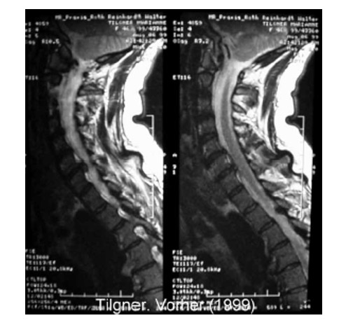 Эффективность лечения оценивалась по данным клинического наблюдения, показаниям электрофизиологических исследований: рентгенографии (включая рентгенографическую компьютерную томографию и магнитно-резонансную томографию (рис. 21а, 21б, 22а, 22б)), параметрам функции внешнего дыхания, показателям гемодинамики при реоэнцефалографии и лазерной допплерографии, компьютерно-оптической топографии позвоночника, электроэнцефалографии, результатам измерения величины электрокожного сопротивления в репрезентативных точках акупунктуры, стабилометрии и др. У всех пациентов независимо от основной патологии при мануальном обследовании выявлены функциональные блокады ПДС, напряжение различных групп мышц (прежде всего в мышцах верхнего плечевого пояса) и наличие в них болевых точек. Выраженность болевого синдрома оценивали по визуально-аналоговой шкале (ВАШ), выраженность тревожной и депрессивной симптоматики определяли по шкале А. Бека.