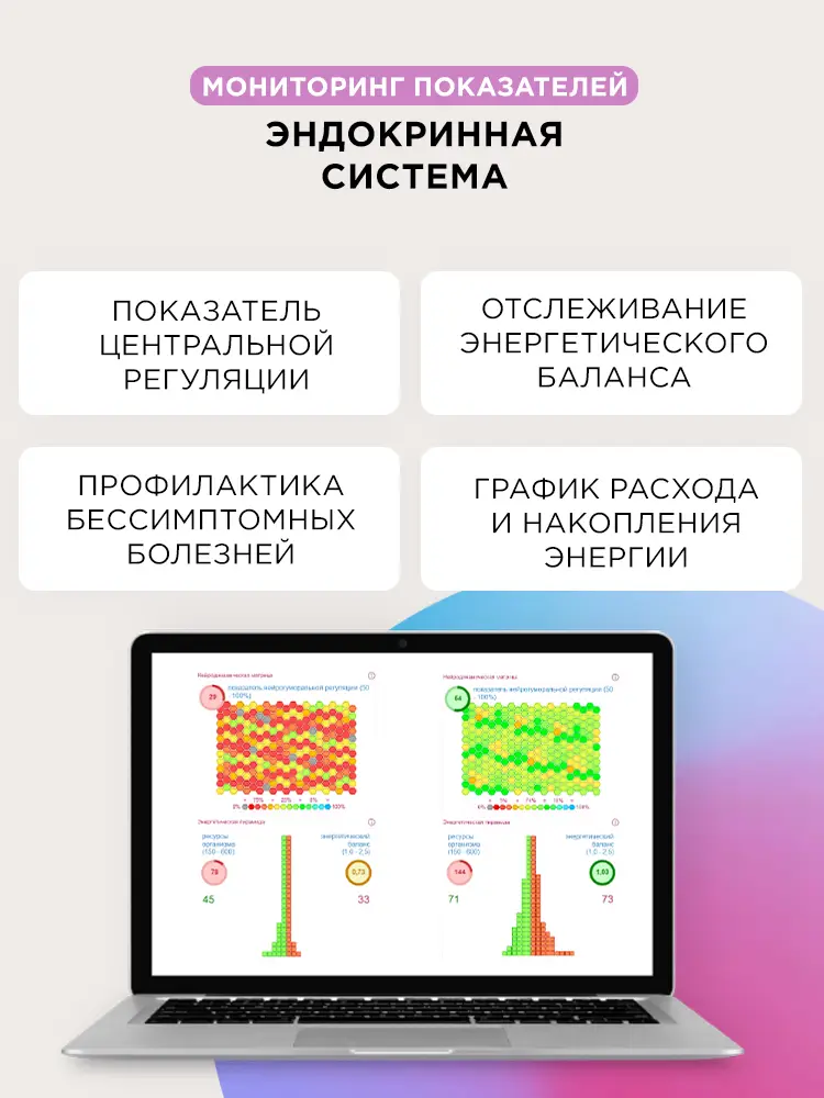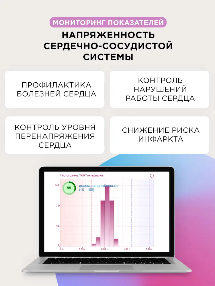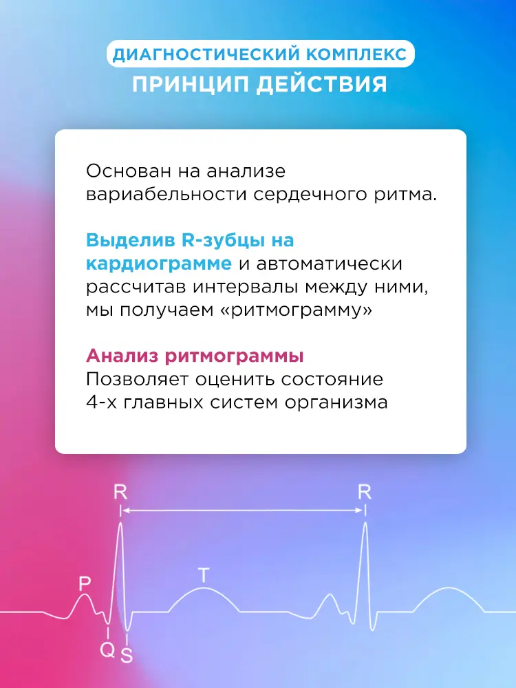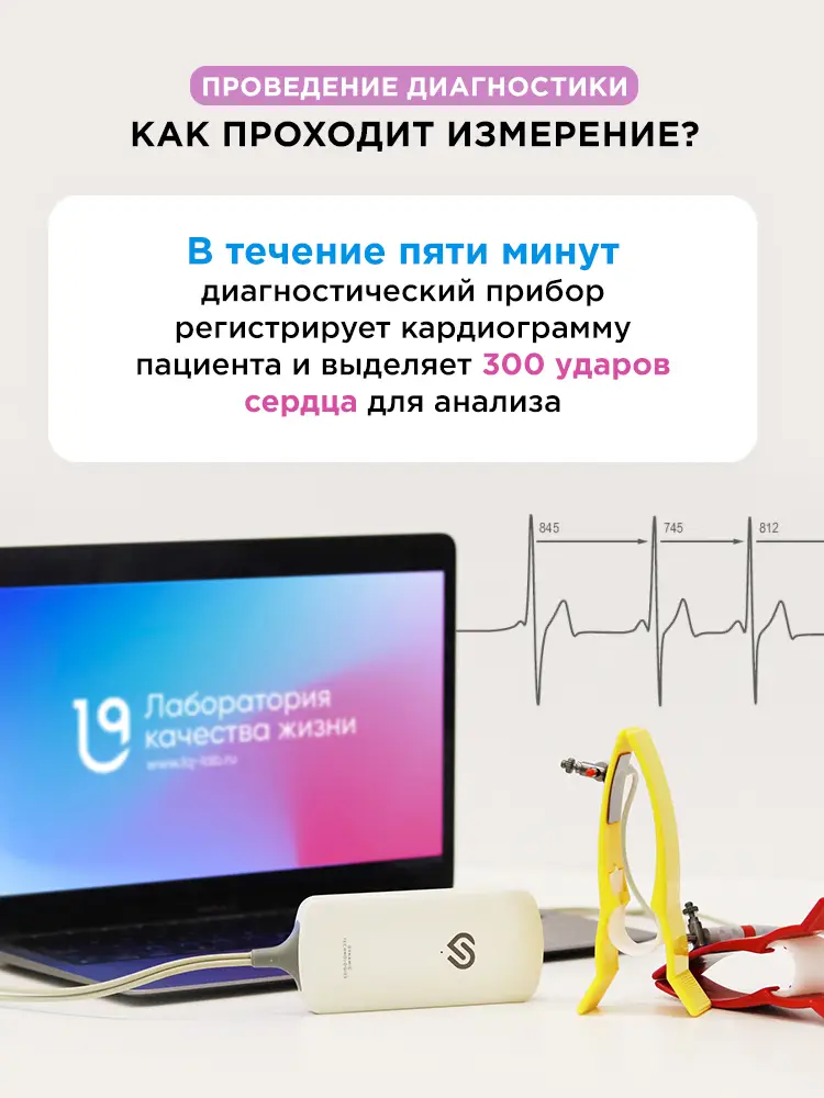 В течение пяти минут диагностический прибор регистрирует кардиограмму пациента и выделяет 300 ударов сердца для анализа и позволяет получить комплексную оценку состояния организма, рассчитать биологический возраст, а при регулярных обследованиях контролировать эффективность различных методов лечения.