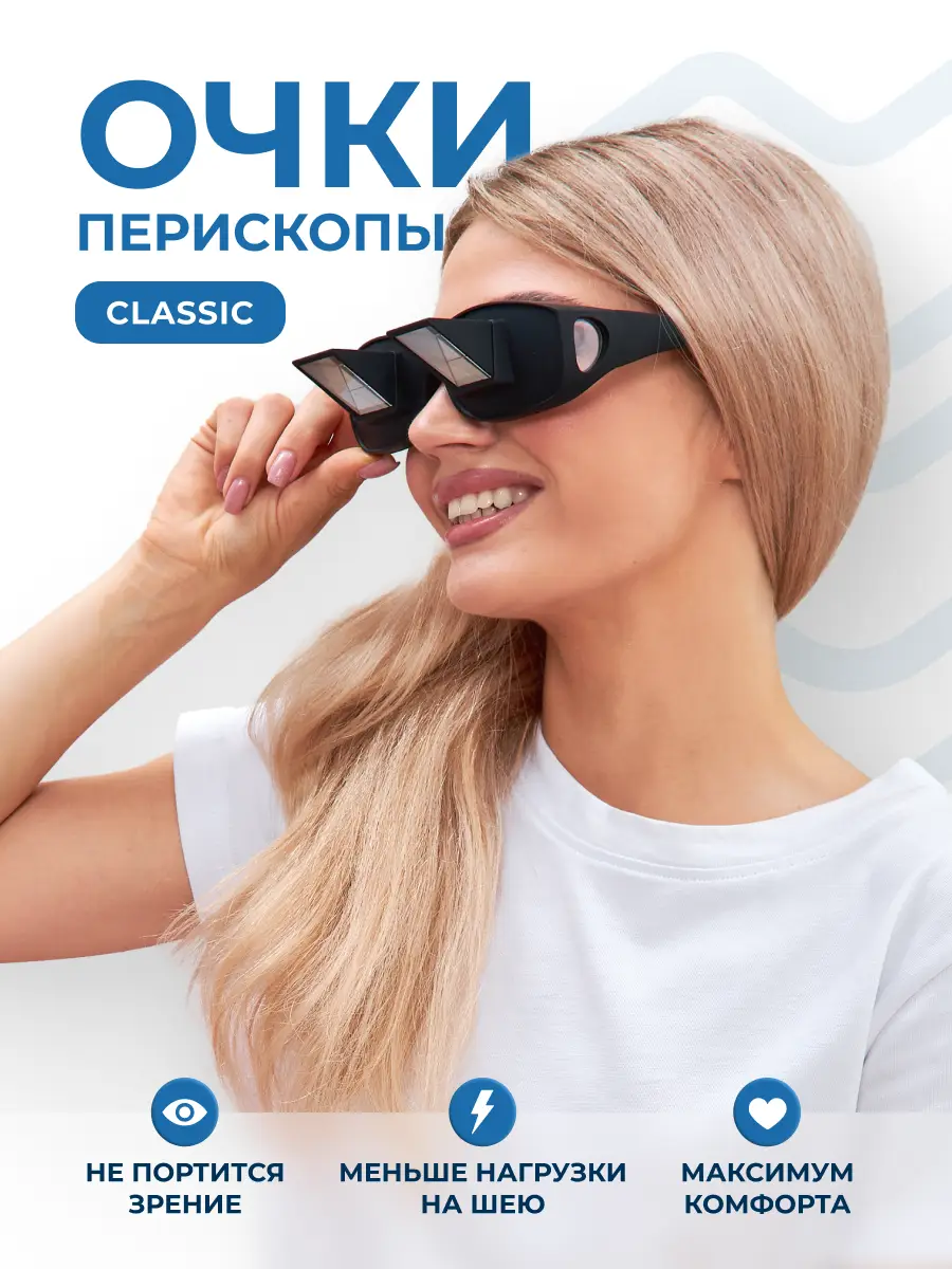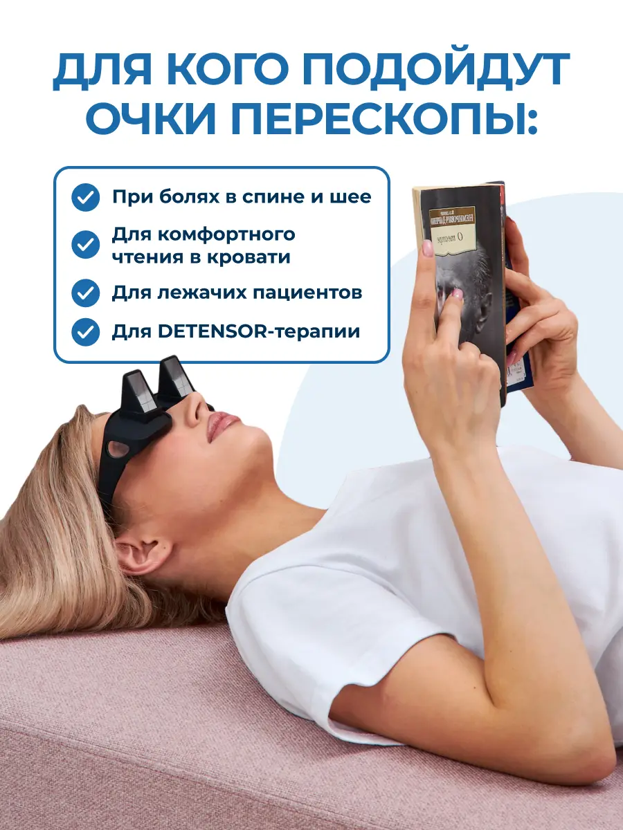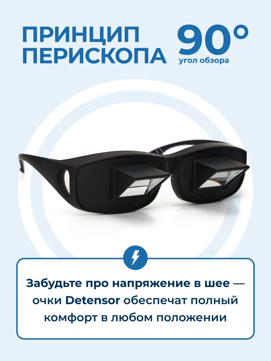 Иногда очень сложно подобрать позу на кровати, чтобы было комфортно лежать при чтении книги или просмотре телевизора. Особенно если болит спина либо шея. Эту проблему полностью решают очки Детензор. Они работают по принципу перископа. То есть, лежа на спине в очках, вы будете видеть не пололок, а то, что находится перед лицом под углом в 90°.