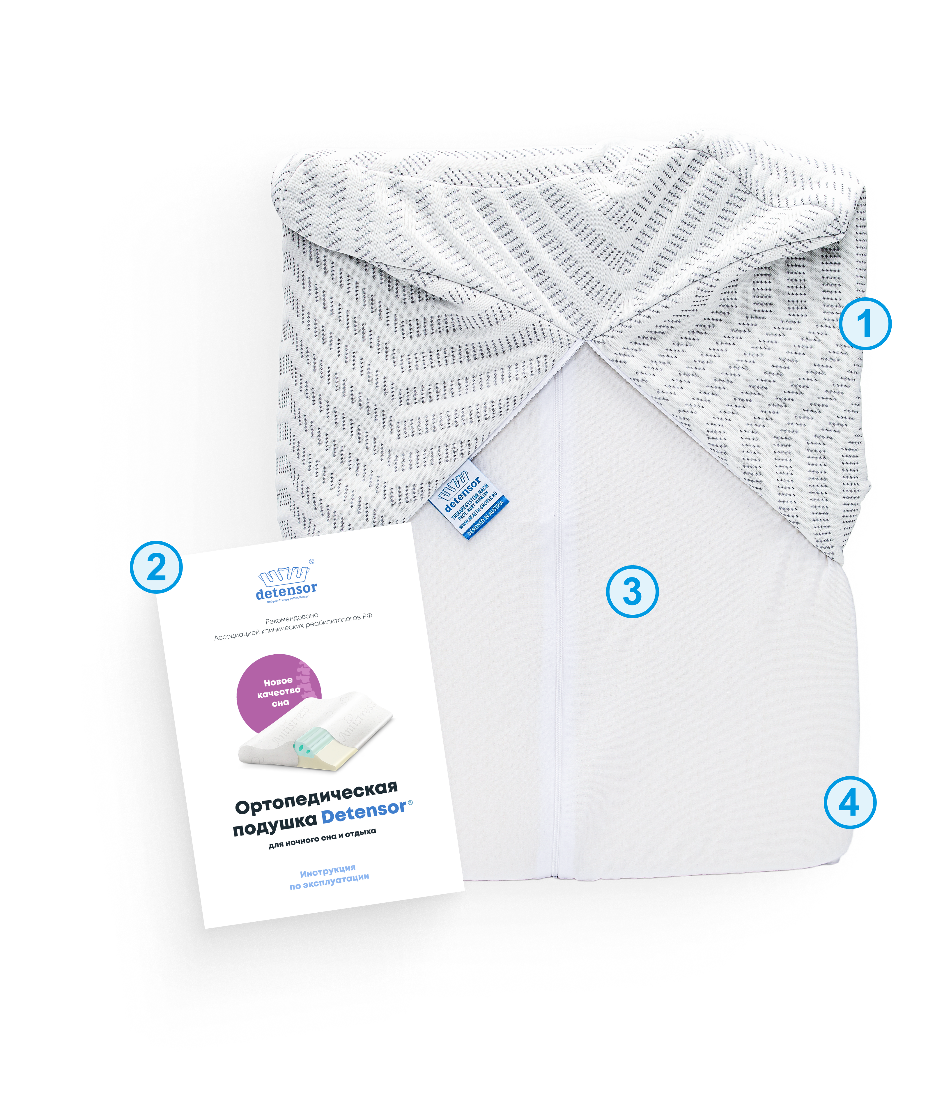 В комплекте вы найдете подушку с эффектом памяти, наволочку, основной чехол и инструкцию по применению.