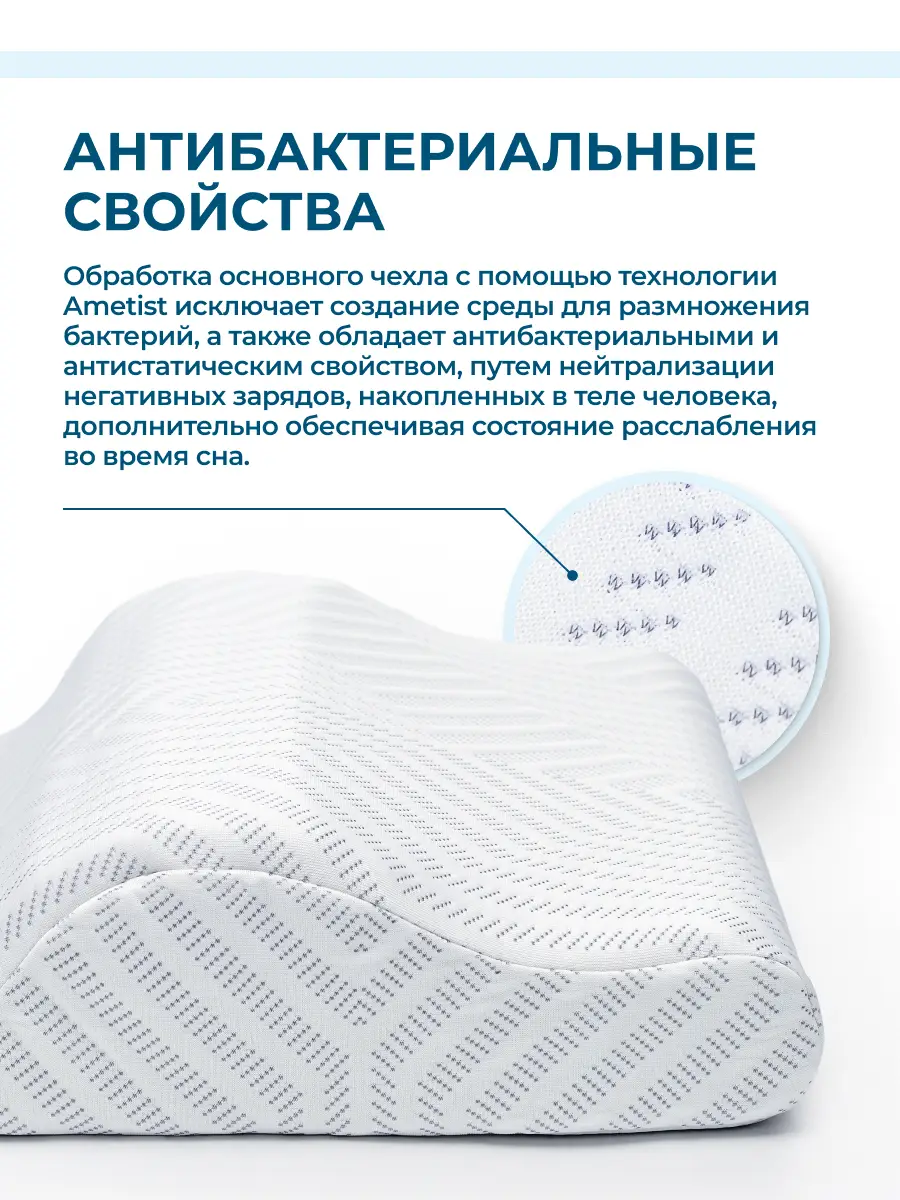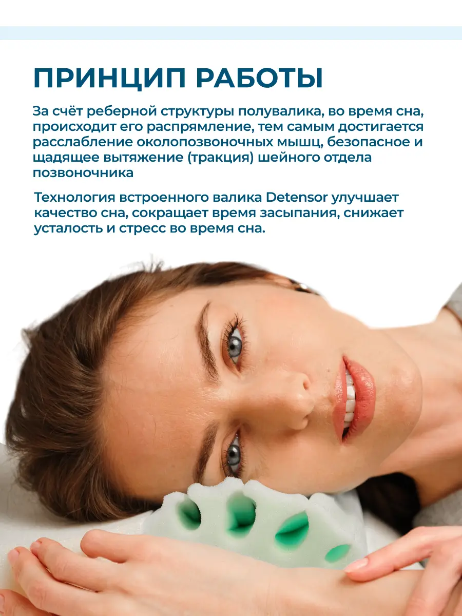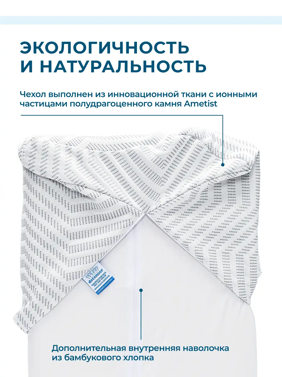 Реберная структура полувалика распрямляется во время сна, обеспечивая мягкое вытяжение шейного отдела позвоночника и расслабление околопозвоночных мышц. Технология Detensor сокращает время засыпания и способствует полному восстановлению организма. Инновационная ткань с ионами аметиста улучшает качество сна и защищает от бактерий.