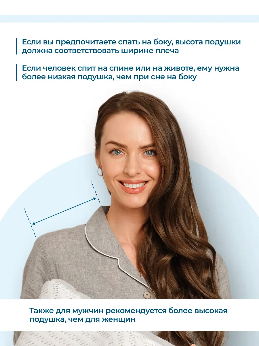 Если вы спите на боку, высота подушки должна соответствовать ширине вашего плеча. Для сна на спине или животе предпочтительна более низкая подушка. Мужчинам обычно требуется более высокая подушка, чем женщинам. Чтобы подобрать высоту подушки, измерьте ширину плеча - это расстояние от основания шеи до плечевой точки.